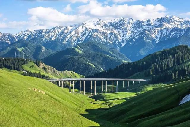 (2)地形地貌:新疆地形复杂,有高山、平原、盆地、沙漠等多种地貌,天山山脉横亘中部,将新疆分为南北两部分。
